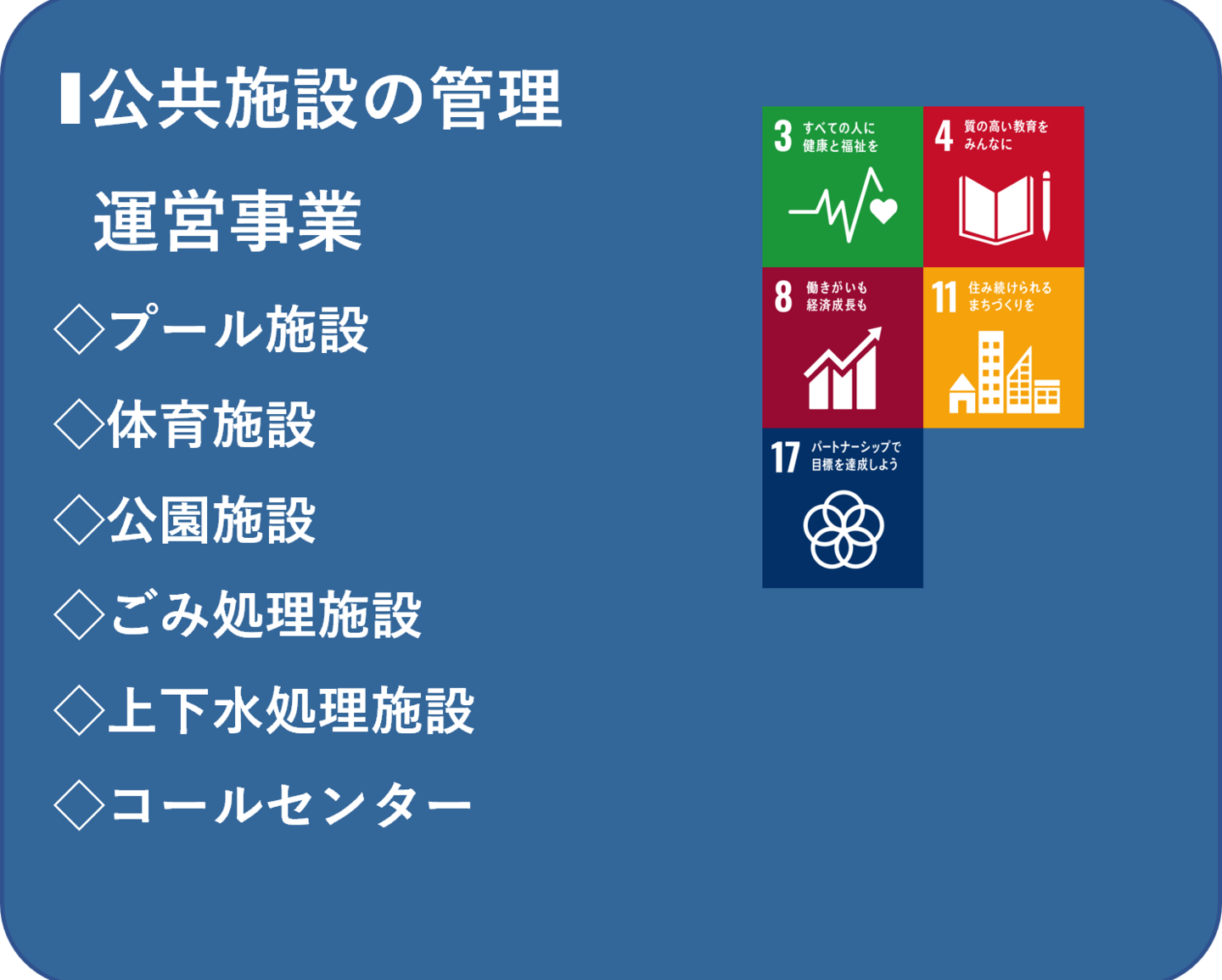 | 業務内容 | 体育施設運営管理、施設運転管理、コールセンター業務、ビルメンテナンス、工業薬品販売、スポーツ用品販売 |